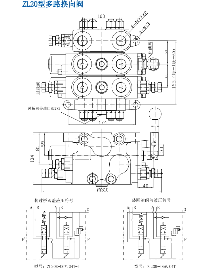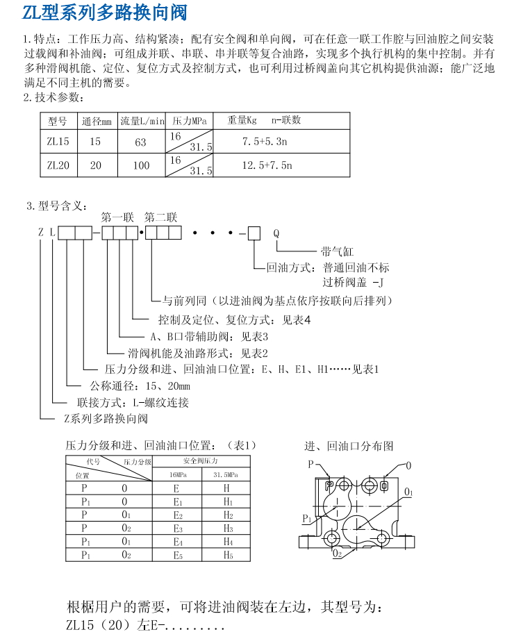 ZL型系列多路換向閥:工作壓力高、結(jié)構(gòu)緊湊;配有安全閥和單向閥,可在任意一聯(lián)工作腔與回油腔之間安裝過(guò)載閥和補(bǔ)油閥;可組成并聯(lián)、串聯(lián)、串并聯(lián)等復(fù)合油路,實(shí)現(xiàn)多個(gè)執(zhí)行機(jī)構(gòu)的集中控制。并有多種滑閥機(jī)能、定位、復(fù)位方式及控制方式,也可利用過(guò)橋閥蓋向其它機(jī)構(gòu)提供油源;能廣泛地滿足不同主機(jī)的需要。